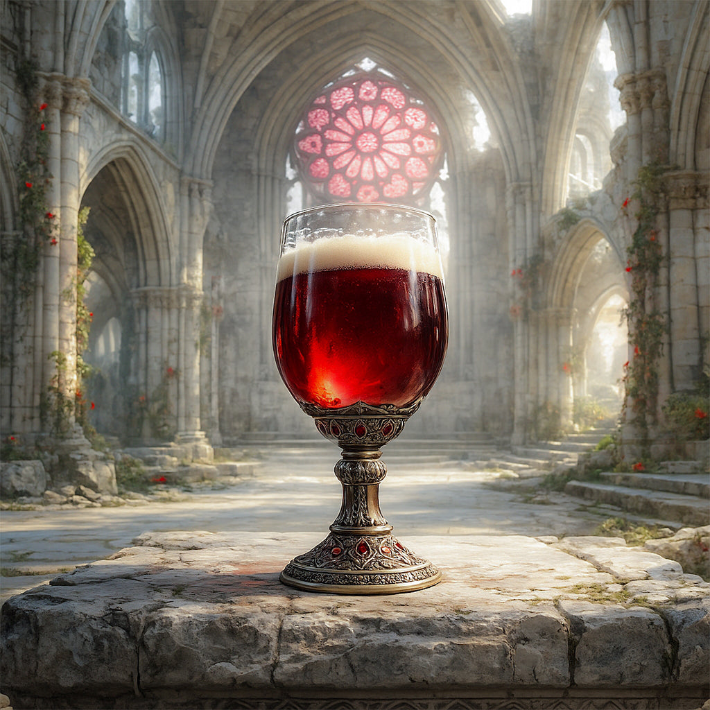As dusk descends over the broken walls of a lost sanctuary, there is that ethereal moment when the final light permeates the stained glass and baths the altar in a soft, rose-colored glow. Legends speak of a chalice revealed in only that hour, filled with a brew as magical as twilight itself. Chalice of Eternal Roselight Belgian Red Ale arises from that luminous pause between day and night. Pouring a deep red hue with copper highlights, this ale opens with aromas of toasted malt, caramel, and subtle fruit. On the palate, smooth malt richness first unfolds, followed by delicate sweetness touched by golden candi syrup and the expressive character of Belgian yeast. Notes of bread crust, light toffee, and a whisper of spice mingle seamlessly, while restrained bitterness keeps the finish clean and balanced. At 5.4% ABV, it is comforting without weight, complex without excess. This is a beer for lingering moments for watching light fade and shadows grow long. So raise the chalice, savor the glow, and drink in the warmth that lives forever in the eternal roselight.