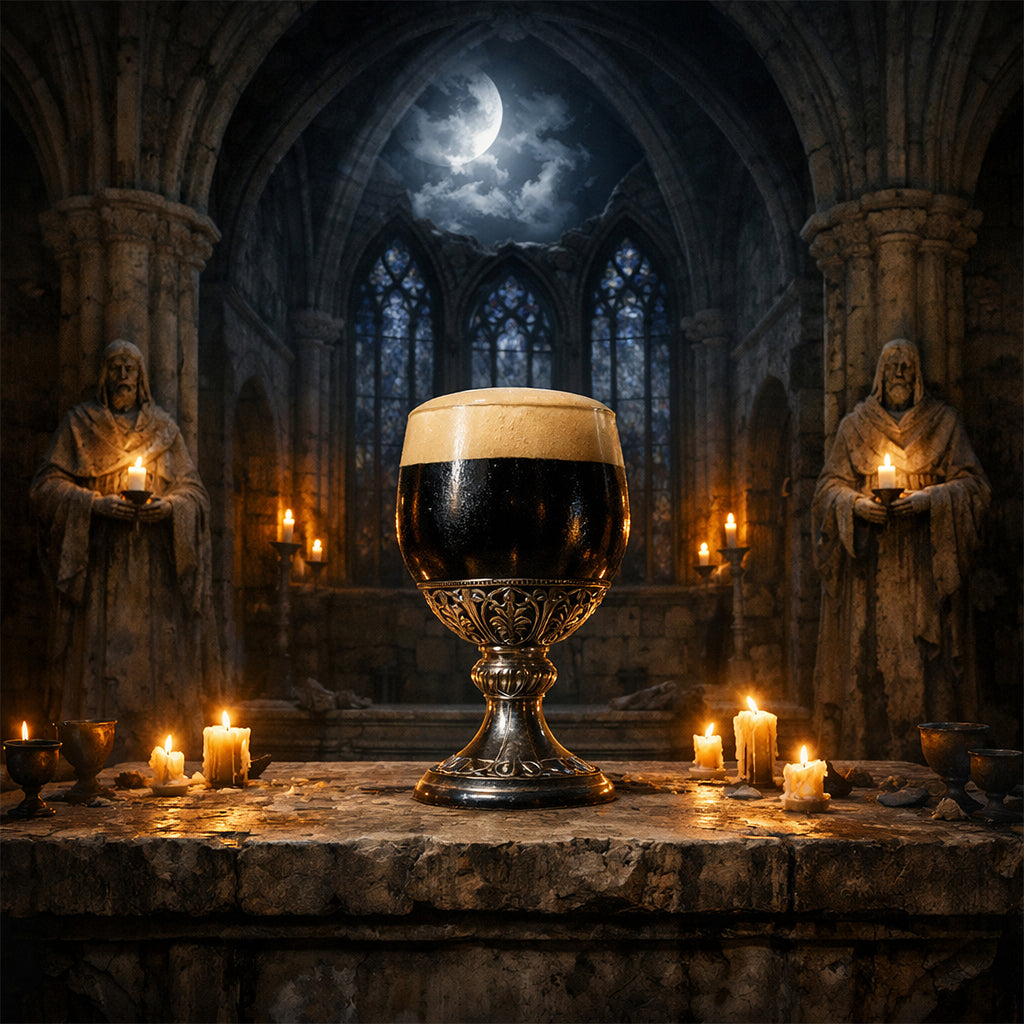 Hark, weary traveler, for you have wandered long beneath a moonless sky, boots heavy with doubt and breath drawn thin by earthen cold silence, when at last a candle’s glow calls you from the dark, bidding you seek shelter within a crumbling chapel where broken stone yet remembers warmth and the night itself. There, upon the altar rests a solitary chalice, its depths darker than the hour, its presence unspoken yet undeniable. The stout gathers like a shadow, near black but given form. Aromas rise, bittersweet, chocolate, roasted grain, a hush of coffee, spice, and distant fruit, restrained like a secret kept too long. You drink, and the cold loosens its hold. The body is smooth, deliberate, unfolding in quiet layers, soft roast, gentle sweetness, a warming calm that lingers without demand. This is no clamor of flavor, but a slow descent, a measured stillness, a gravity that invites surrender rather than insists upon it. You lift the chalice once more, knowing well that comfort, once found, need not be lost, and that some choose, willingly and without regret, to remain, to dwell, to live forever in the Eternal Abyss.